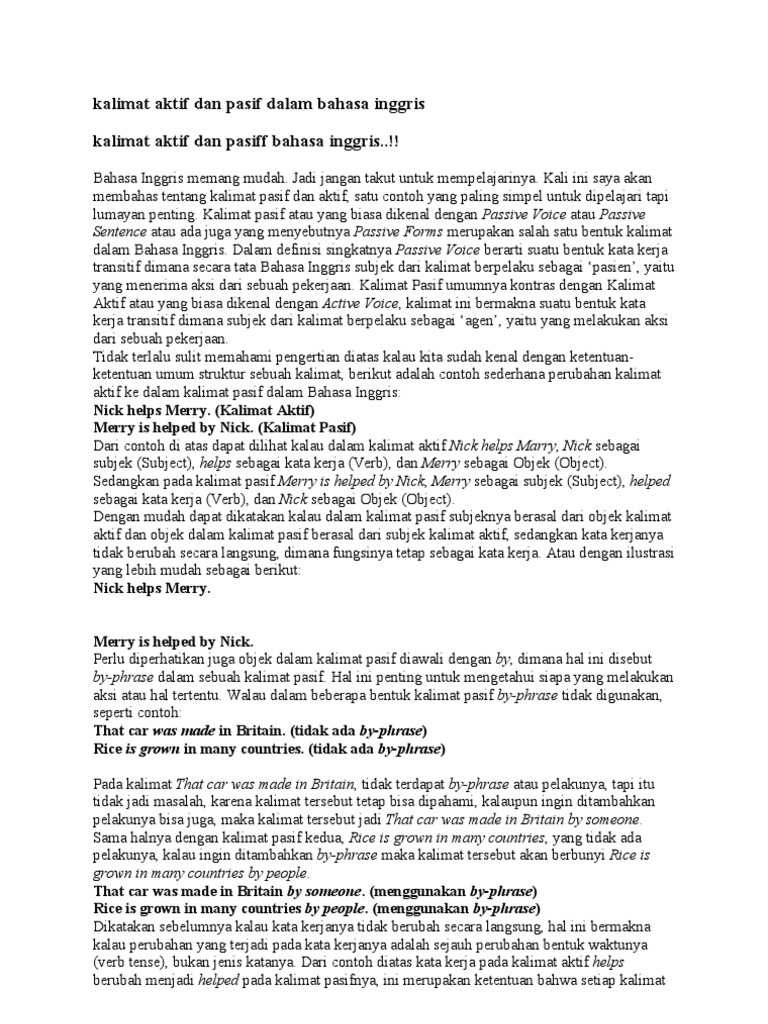 Kalimat dalam bahasa inggris bisa berbentuk aktif maupun pasif. Bagi sebagian orang yang memang sudah lama belajar bahasa inggris tentunya hal ini bukanlah sesuatu yang sulit. Perlu nggak sih belajar rumus agar mahir tenses. Karena admin yakin sahabat kbi sudah memahaminya, kita kali ini aka lebih memperbanyak contoh. 5 contoh kalimat pasif dalam bahasa inggris dan artinya berupa percakapan pendek. Contoh simple past tense bahasa inggris menjadi sangat penting karena menjadi dasar untuk memahami narrative text apa dan bagaimana kalimat verbal dalam bahasa inggris itu. Dan pada kesempatan kali ini kita berikan 100 kalimat bahasa inggris yang disertai terjemahannya untuk mempermudah sobat ec untuk mempelajari nya. Seperti kalimat pasif pada umumnya, kalimat pasif tindakan menjadikan subjek sebagai penderita atau korban. Tapi aku mau ke toilet dulu ya. asa : Anton watched the film in the theatre yesterday. Dibuat oleh penulis sendiri dengan mempertimbangkan tingkat keberterimaan kata kunci: Selanjutnya akan kita lanjutkan dengan melihat contoh kalimatnya dalam berbagai tenses bahasa inggris. Di dalam artikel bahasa inggris kelas 11 ini, kamu akan mempelajari rumus dan contoh dari kalimat passive voice.